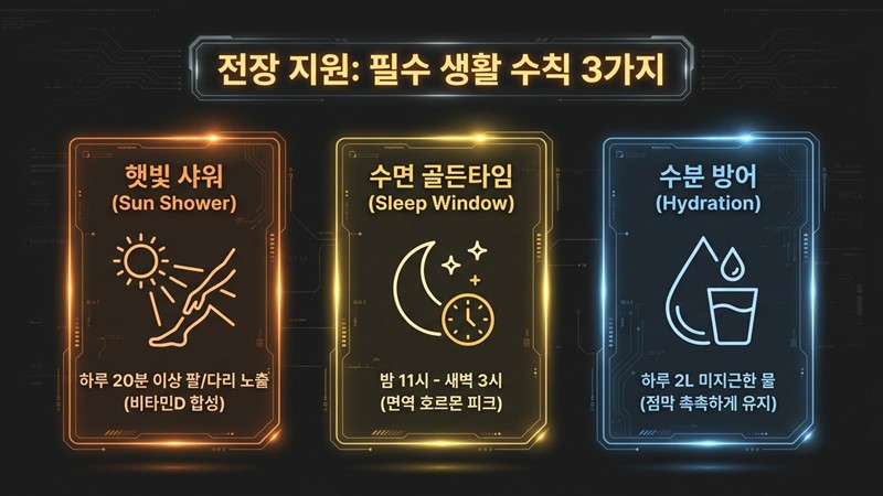 - 햇빛 샤워: 하루 20분 이상 팔다리를 노출하고 햇빛을 쬐면 비타민D 합성에 도움이 돼요.