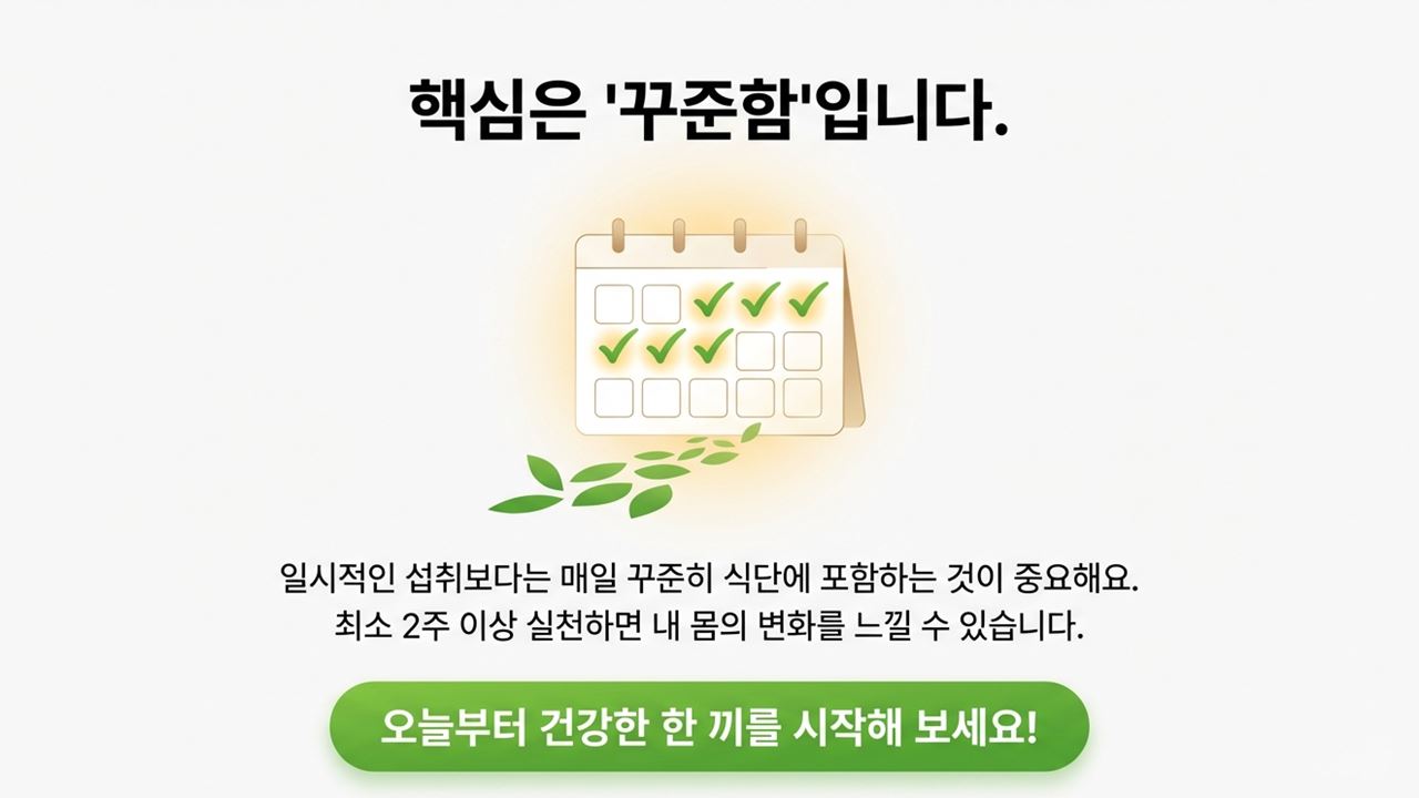 A: 일시적인 섭취보다는 매일 꾸준히 식단에 포함하는 것이 중요해요. 최소 2주 이상 실천해 보세요.