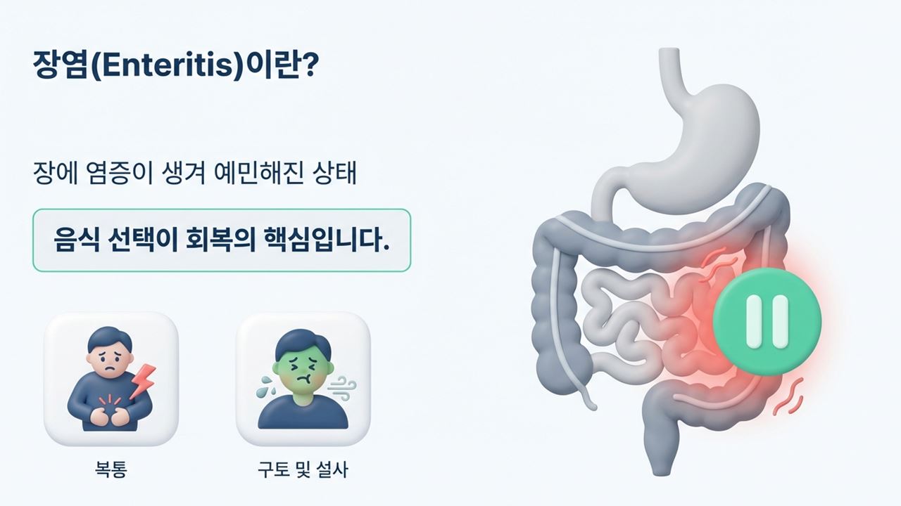 장염은 우리 몸의 장에 염증이 생겨서 발생하는 질환이에요. 주로 오염된 음식이나 바이러스 때문에 발생하며 복통과 구토를 동반하죠. 장이 예민해진 상태라 음식 선택이 회복의 핵심이 된답니다.