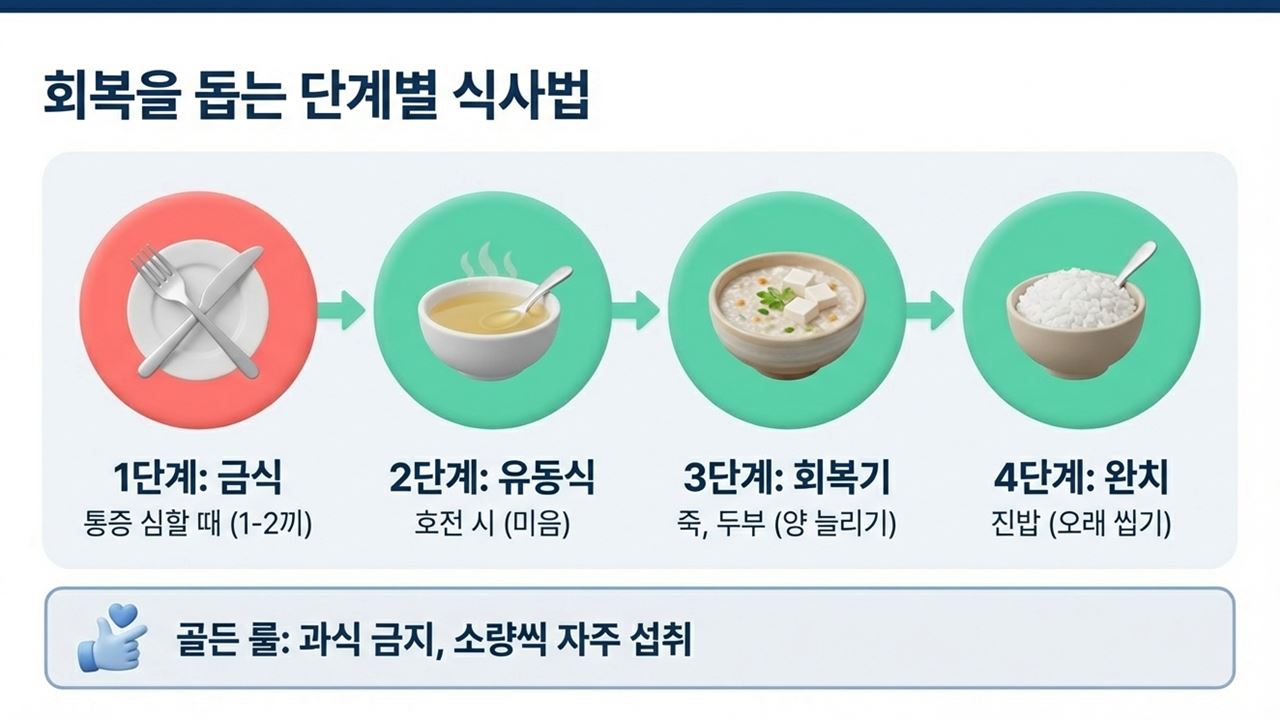 처음 통증이 심할 때는 한두 끼 정도 금식을 하는 것도 방법이에요. 장이 쉴 수 있는 시간을 충분히 주는 것이죠. 그 후 증상이 나아지면 미음부터 시작해서 천천히 식사량을 늘려가세요.
