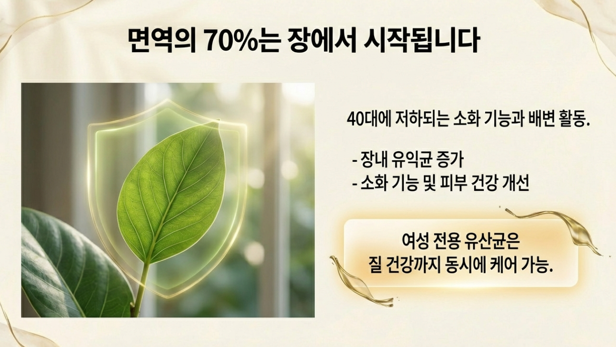 우리 몸 면역 세포의 70% 이상이 장에 집중되어 있다는 사실을 알고 계셨나요? 40대에는 소화 기능이 떨어지고 배변 활동이 원활하지 않을 수 있어 유산균(프로바이오틱스) 섭취가 필요해요. 장내 유익균의 비율을 높여주면 소화뿐만 아니라 피부 건강까지 좋아질 수 있어요.