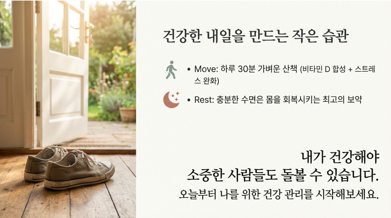 영양제만큼 중요한 것은 규칙적인 생활과 균형 잡힌 식단이에요. 하루 30분 정도의 가벼운 산책은 스트레스를 낮추고 비타민 D 합성을 도와요. 충분한 수면은 우리 몸이 스스로 회복할 시간을 주는 아주 중요한 보약과도 같죠.
