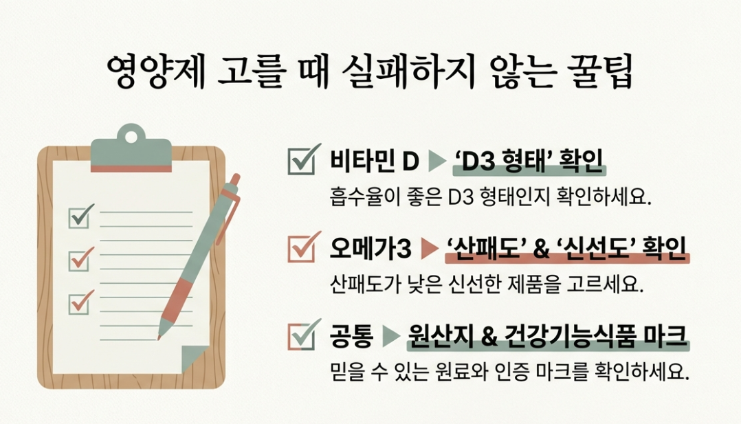 오메가3의 경우 산패도가 낮은 신선한 제품인지 확인하는 것이 중요해요. 비타민 D는 흡수율이 좋은 D3 형태를 선택하는 것이 효율적이죠. 또한 너무 저렴한 제품보다는 믿을 수 있는 제조사의 공신력 있는 원료를 썼는지 살펴보는 지혜가 필요해요. 자신의 몸 상태에 맞춰 전문가와 상의 후 결정하면 더 완벽하겠죠?