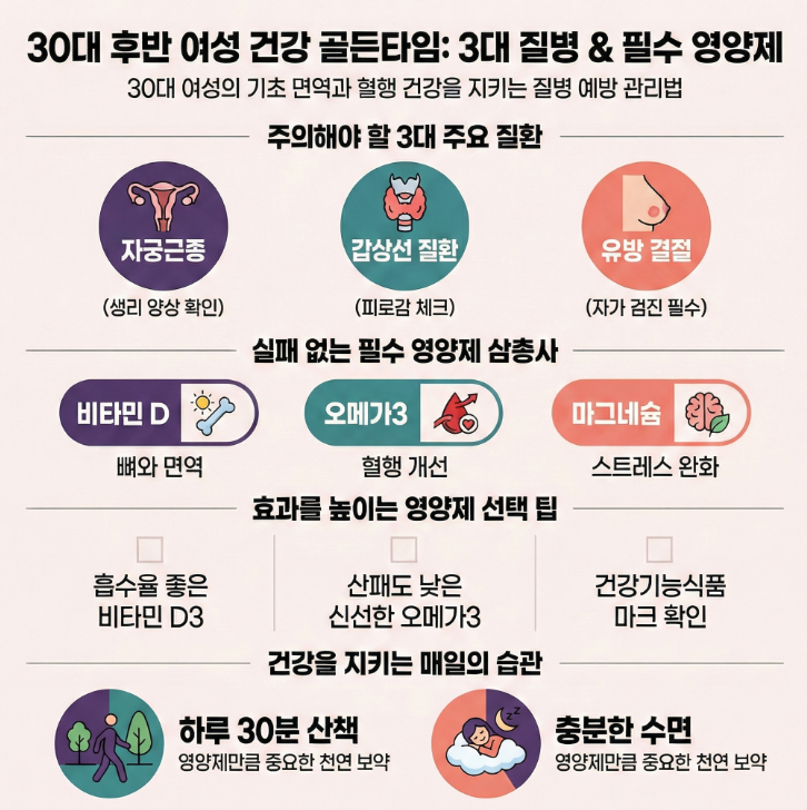 주요 질환 핵심 증상 관리 포인트 자궁근종 생리통 심화, 생리량 증가 6개월 단위 초음파 추적 관찰 갑상선 질환 만성 피로, 추위/더위 민감 혈액 검사를 통한 수치 확인 유방 결절 가슴 멍울, 통증 발생 정기적인 유방 초음파 검사 실패 없는 30대 여성 필수 영양제 추천
