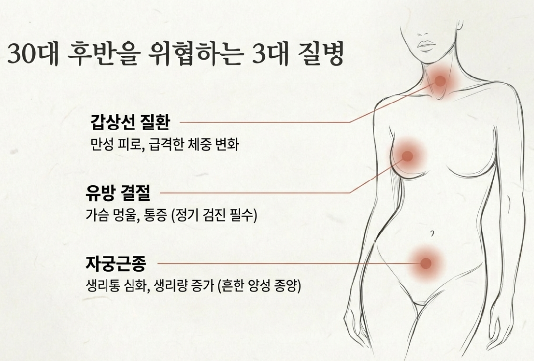 30대 후반은 호르몬 변화와 스트레스로 인해 특정 질환이 자주 발생해요. 건강검진에서 가장 흔하게 발견되는 세 가지 질환을 미리 알고 대비하는 것이 중요하죠. 자궁근종, 갑상선 질환, 그리고 유방 질환이 대표적인 주의 대상입니다.