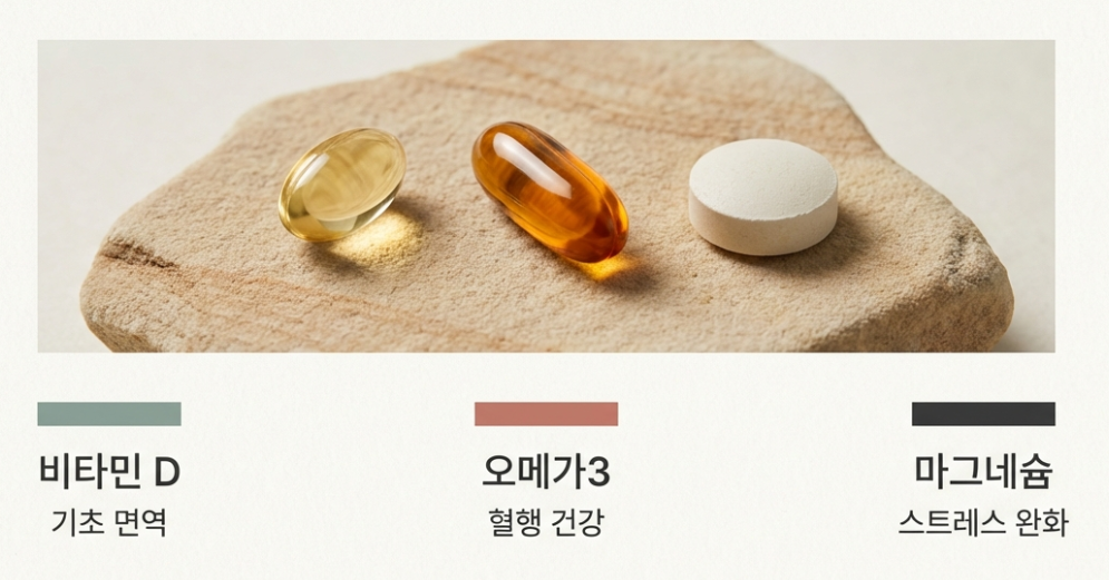 30대 후반 여성에게 가장 추천하는 삼총사는 바로 비타민 D, 오메가3, 그리고 마그네슘입니다. 이들은 우리 몸의 기초 면역과 혈행 건강을 책임지는 고마운 성분들이에요.